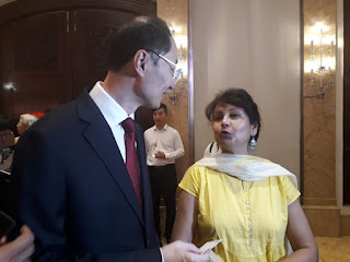 Sun Weidong who is an Asia expert and has come to India on his second stint, the first one as Councillor from 2005-08 in the Chinese embassy in India, struck similarities between Indian and Chinese society. Revealing admiration for Bollywood films he said, ‘Recently, I watched an Indian movie called Hindi Medium. It is about a young Indian couple, who tried desperately to get a better education for their daughter. Such feelings of parents are not only seen in India, but also in Chinese families’,said Sun. The box office of Indian films is twice as much in China as in India. The Indian pavilion at the Beijing International Horticultural Expo has attracted millions of Chinese visitors. With the long history, large population and economic volume of the two countries, China-India cooperation enjoys vast potential for development, he informed the mixed audience of Heads of Missions, media, Chinese guests, business representatives and others present.